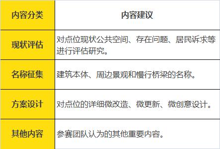 参赛者可根据微改造、微更新、微创意设计的主要关注点选择切入点作重点设计,也可在调研分析的基础上,自行提出该地点需重点解决问题,拟定主题进行详细设计。