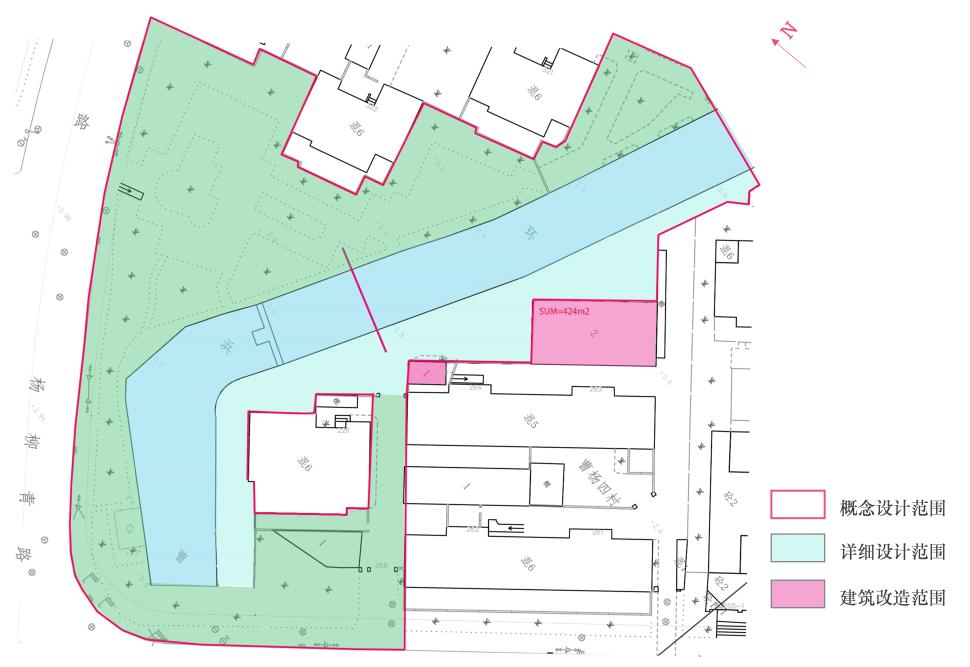 设计内容包含五部分:“一河”、“一馆”、“一桥”、“一园”、“一名”。其中,“一河”即环浜及两岸滨水活动空间;“一馆”即环浜南侧规划的社区美好生活体验馆(以下简称:体验馆);“一桥”即规划横跨环浜,连接两岸生活的慢行桥;“一园”即现状杏杨园;“一名”即为美好生活体验馆命名。