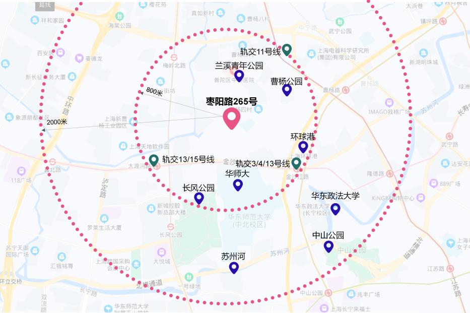 基地位于曹杨新村内的枣阳路 265 号,紧临环浜,对外交通便利,周边 800 米范围内可换乘 3、4、11、13、15 等轨道交通;2 公里范围内可到达曹杨公园、长风公园、中山公园、华师大、华东政法、 环球港、苏州河等城市级公共服务设施。