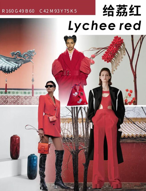 东方色彩是活的,给荔红有着一种对民族希望,与美好祝愿的色彩背景;在2022秋冬将继续延续其色彩趋势,以红色为贵,特别在重大节日仪式上,将红色推向极致;我们预计它的影响将拓展至各时尚品类,打造出中性全身造型,多应用于季节性印花的图案设计。