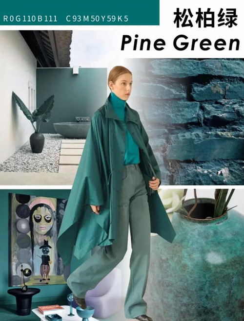松柏绿这一复古色彩已在休闲装市场兴起,预计该色彩在2022秋冬的吸引力将进一步扩大,可将其应用于运动装、男装与配饰,亦可与海军蓝、白色、灰色等经典色彩搭配使用。