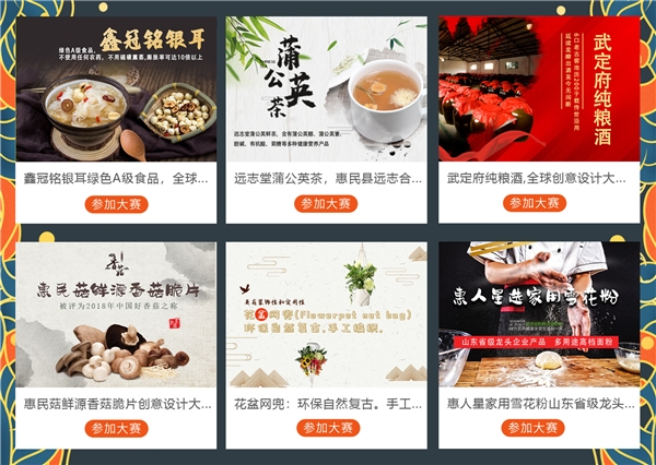 惠民县网货化产品创意设计大赛中的参赛农特产品:都是山东惠民县本地有特色的农特产品,有山东省老字号,100种特色旅游美食商品之一《杜桥豆干》;统配方与工艺“中华老字号”全国征集大赛的《武定府酱菜》;菊润农业科技产品的《惠白菊茶》;无抗生素、无激素、无农药残留、绿色无公害,是消灭人体内自由基的酶当中担当重要任务的《德顺祥富硒鸡蛋》;不使用任何农药,不用硫磺熏蒸,膨胀率可达10倍以上的绿色A级食品《鑫冠铭银耳》;6口老古窖池历200于载传世沿用,延续发酵出酒至今无间断的《武定府纯粮酒》;含有蒲公英醇、蒲公英素、胆碱、有机酸、菊糖等多种健康营养产品《远志堂蒲公英鲜茶》;被评为2018年中国好香菇之称的《菇鲜源香菇脆片》;山东省级龙头企业产品,多用途高档面粉《惠人星选家用雪花粉》;环保自然复古。手工编织,具装饰性和实用性的《花盆网兜(Flowerpot net bag)》
