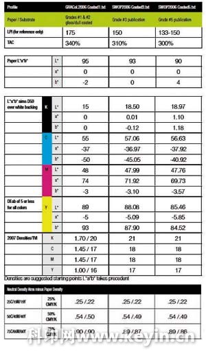 GRACoL组织自1996年建立后,于1997年开始出版其刊物。2000年,GRACoL组织开始为商业胶印制定规范书,2002年出版《GRACoL6》规范书后开展了一系列的研究,创新出新的控制技术-“G7”,并把基于“G7”产生的新数据集正式收录在2006年出版的《GRACoL7》规范书中。目前,《GRACoL2007》是GRACoL组织出版的最新规范书。GRACoL的新旧规范举例如下: